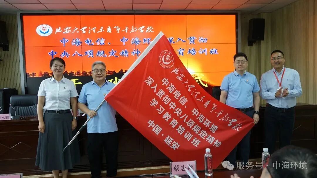 延安大学教育培训学院副院长王娜致欢迎词,并简要介绍了延安大学的历史底蕴以及此次培训的重要意义,希望学员们深刻领悟延安精神的内涵,将其转化为工作中的强大动力。仪式最后,王娜副院长向中海环境党总支书记、总经理张军,中海电信党委副书记、副总经理刘建斌,授予班旗,标志着此次培训正式启航。